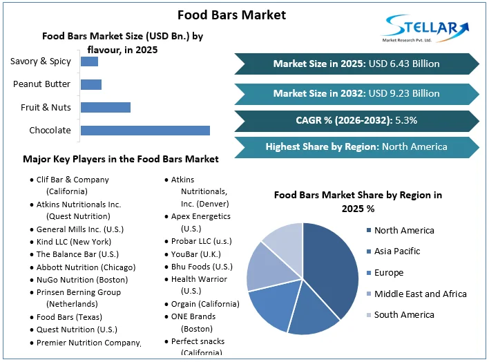 The Food Bars Market size was valued at USD 6.43 Bn. in 2025 and the total Global Food Bars revenue is expected to grow at a CAGR of 5.3% from 2026 to 2032, reaching nearly USD 9.23 Bn. by 2032.