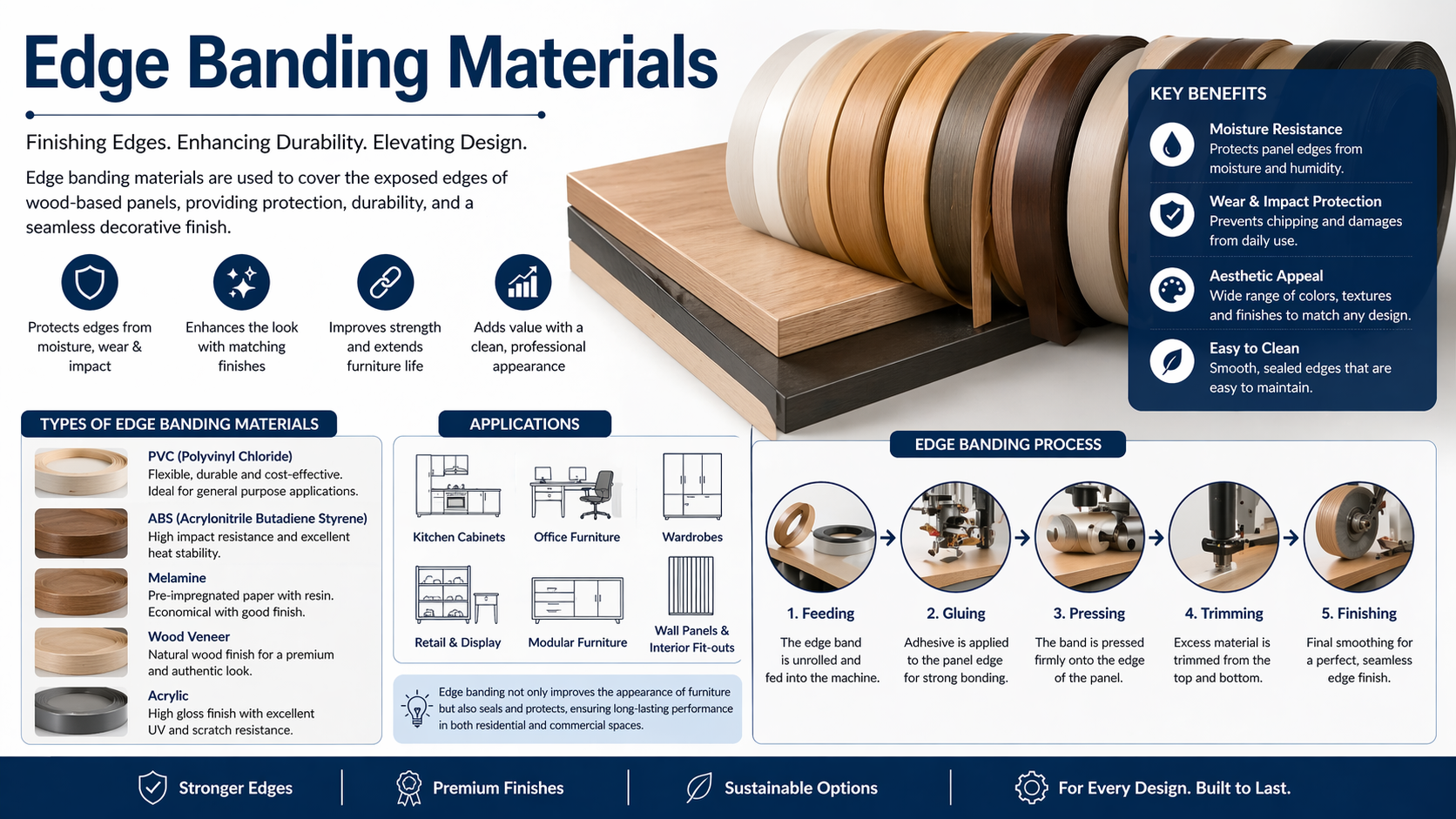 Edge banding materials are narrow strips applied to the exposed edges of panels such as plywood, MDF, and particleboard to enhance durability and improve visual appeal. These materials are widely used in furniture manufacturing, cabinetry, and interior applications due to their protective properties and aesthetic finishing capabilities.