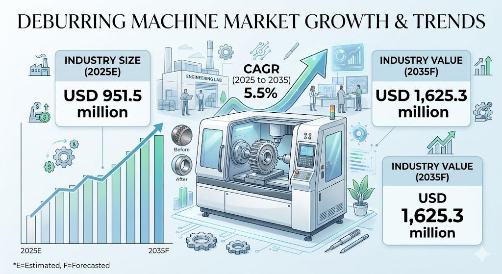 the global Deburring Machine Market is entering a transformative growth phase, fueled by the rising demand for precision-engineered components, rapid automation adoption, and the evolution of smart manufacturing ecosystems. According to the latest analysis, the market is projected to grow from USD 951.5 million in 2025 to USD 1,625.3 million by 2035, registering a steady CAGR of 5.5% during the forecast period.