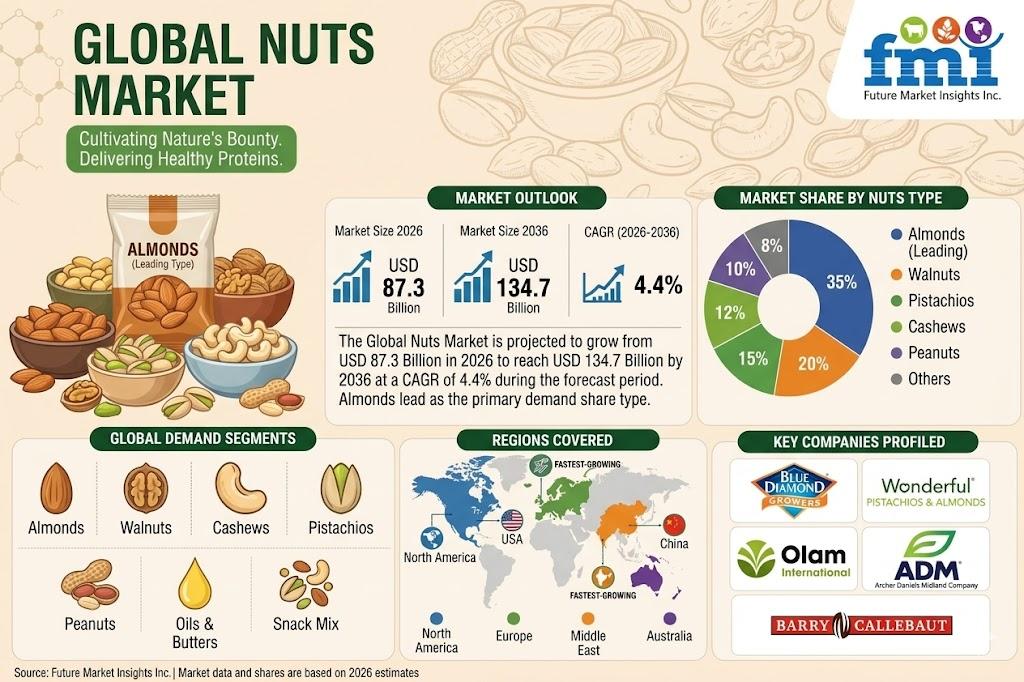 NEWARK, Del., USA | April 27, 2026 — According to the latest analysis by Future Market Insights (FMI), the global nuts market is projected to grow from USD 87.3 billion in 2026 to USD 134.7 billion by 2036, registering a CAGR of 4.4% during the forecast period. Growth is being driven by rising demand for nutrient-dense snacks, increasing adoption in food processing applications, and premiumization trends centered around origin and quality transparency.