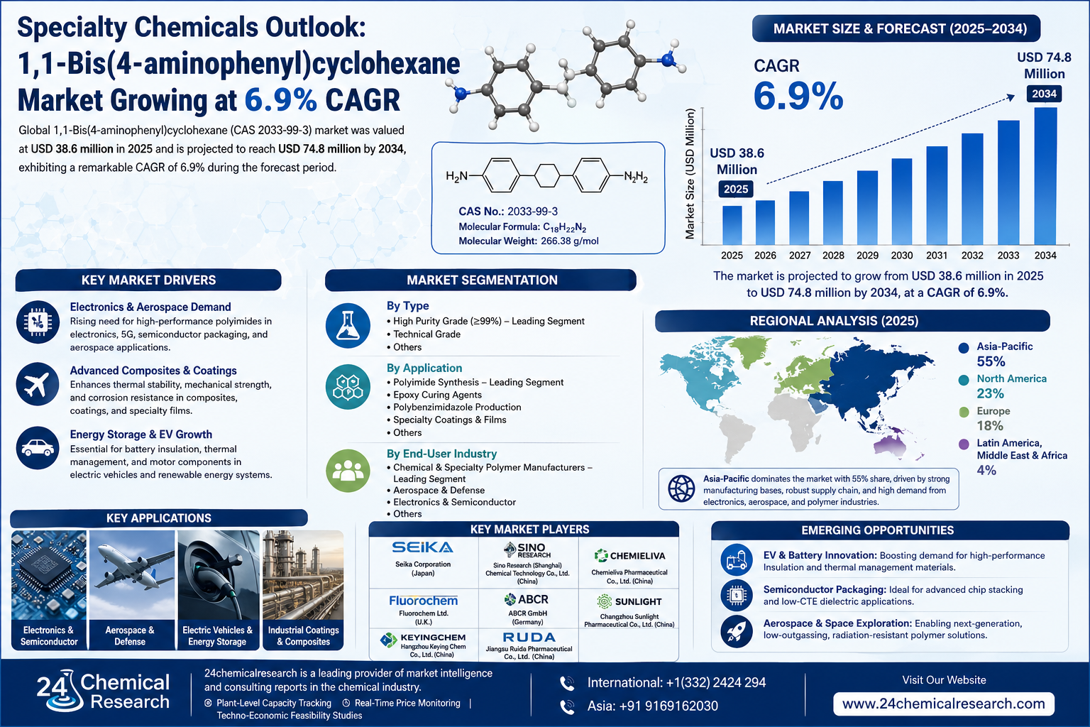 Global 1,1-Bis(4-aminophenyl)cyclohexane (CAS 2033-99-3) market was valued at USD 38.6 million in 2025 and is projected to reach USD 74.8 million by 2034, exhibiting a remarkable CAGR of 6.9% during the forecast period.