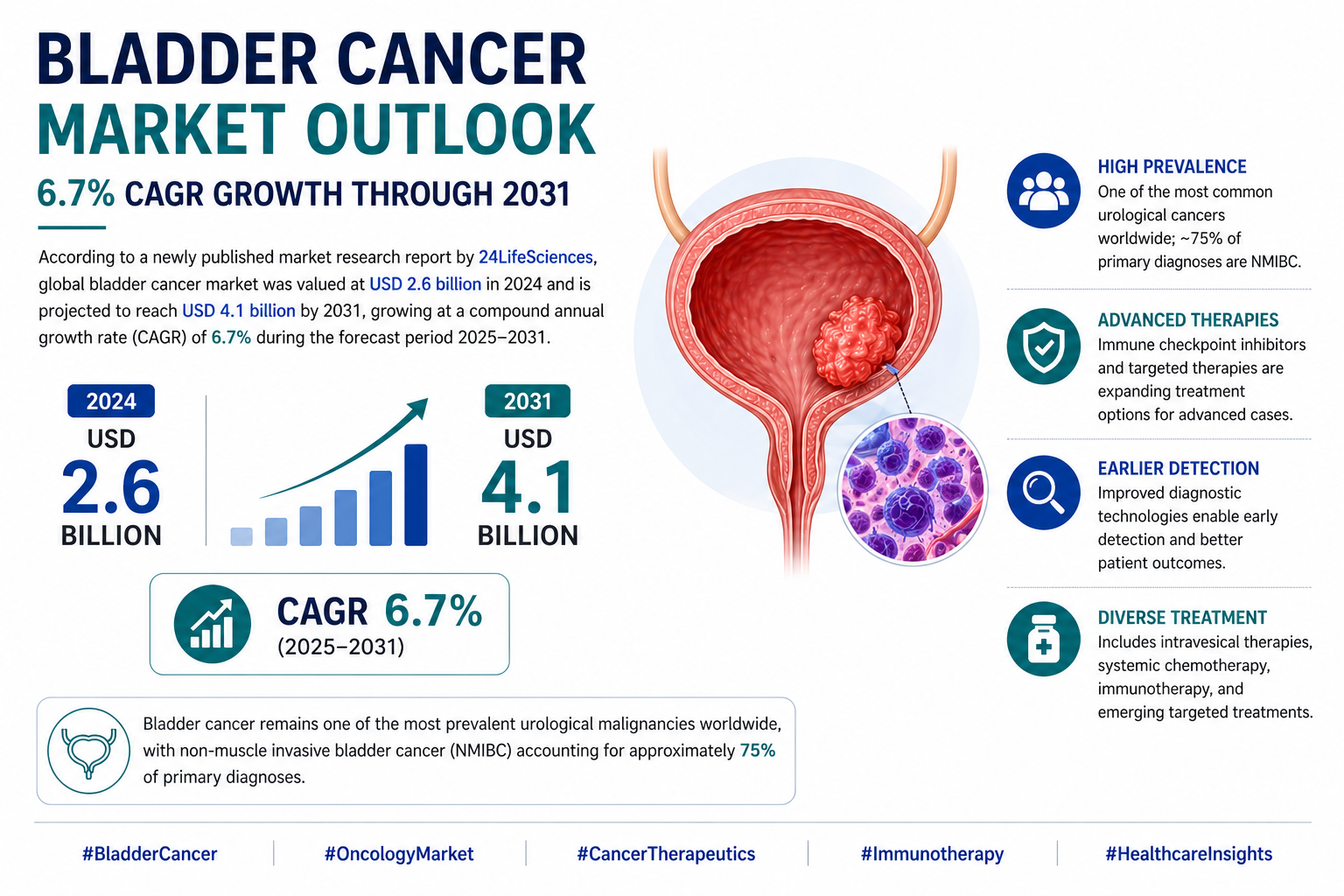 According to a newly published market research report by 24LifeSciences, global bladder cancer market was valued at USD 2.6 billion in 2024 and is projected to reach USD 4.1 billion by 2031, growing at a compound annual growth rate (CAGR) of 6.7% during the forecast period 2025-2031.