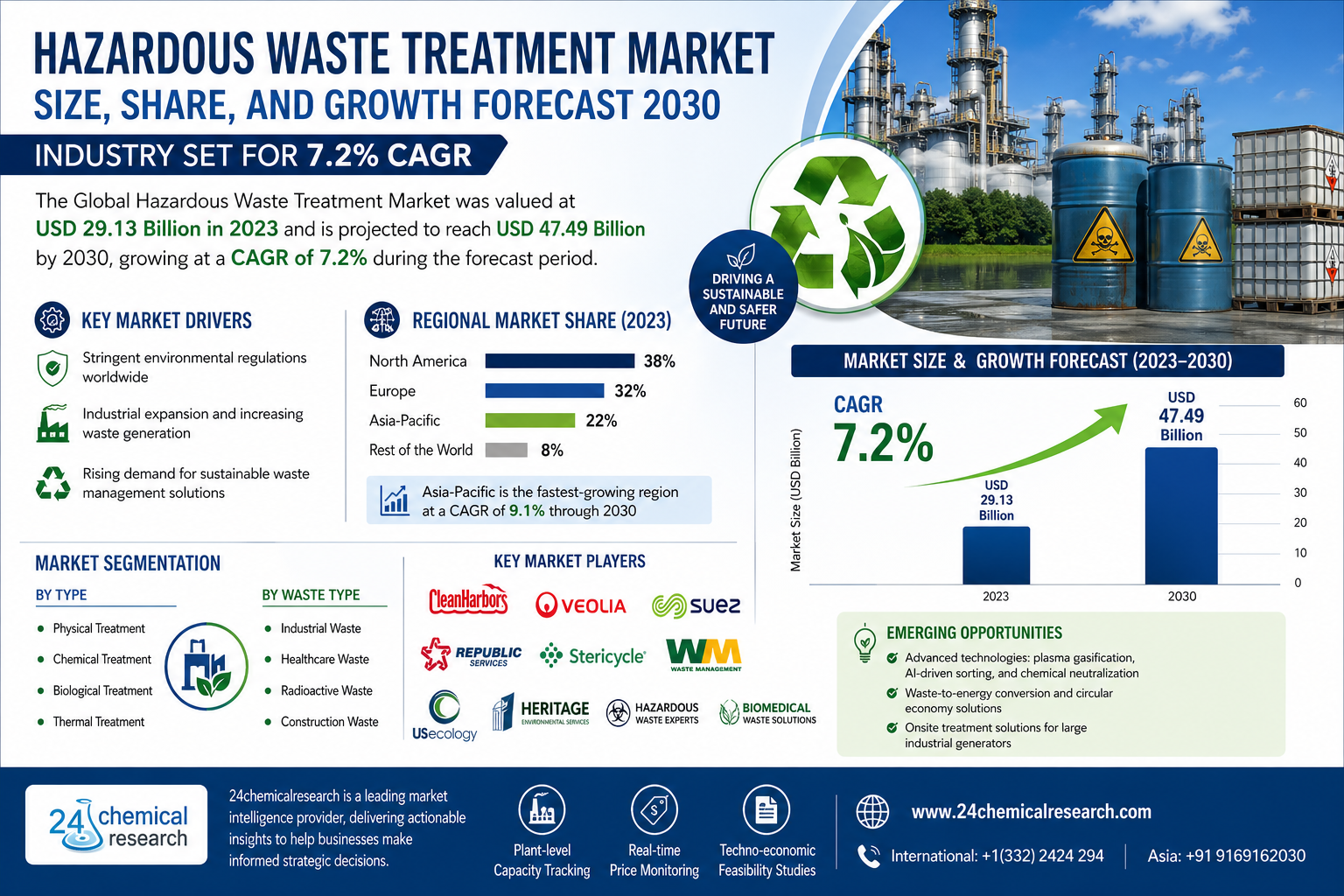 Global Hazardous Waste Treatment Market continues to demonstrate robust growth, with its valuation reaching USD 29.13 billion in 2023. According to the latest industry analysis, the market is projected to grow at a CAGR of 7.2%, reaching approximately USD 47.49 billion by 2030. This growth is driven by increasing environmental regulations, industrial expansion, and the urgent need for sustainable waste management solutions across key sectors.