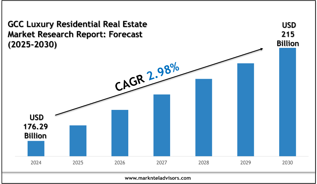 As per MarkNtel The GCC Luxury Residential Real Estate Market size was valued at around USD 176.29 billion in 2024 and is projected to reach USD 215 billion by 2030. Along with this, the market is estimated to grow at a CAGR of around 2.98% during the forecast period, i.e., 2025-30.