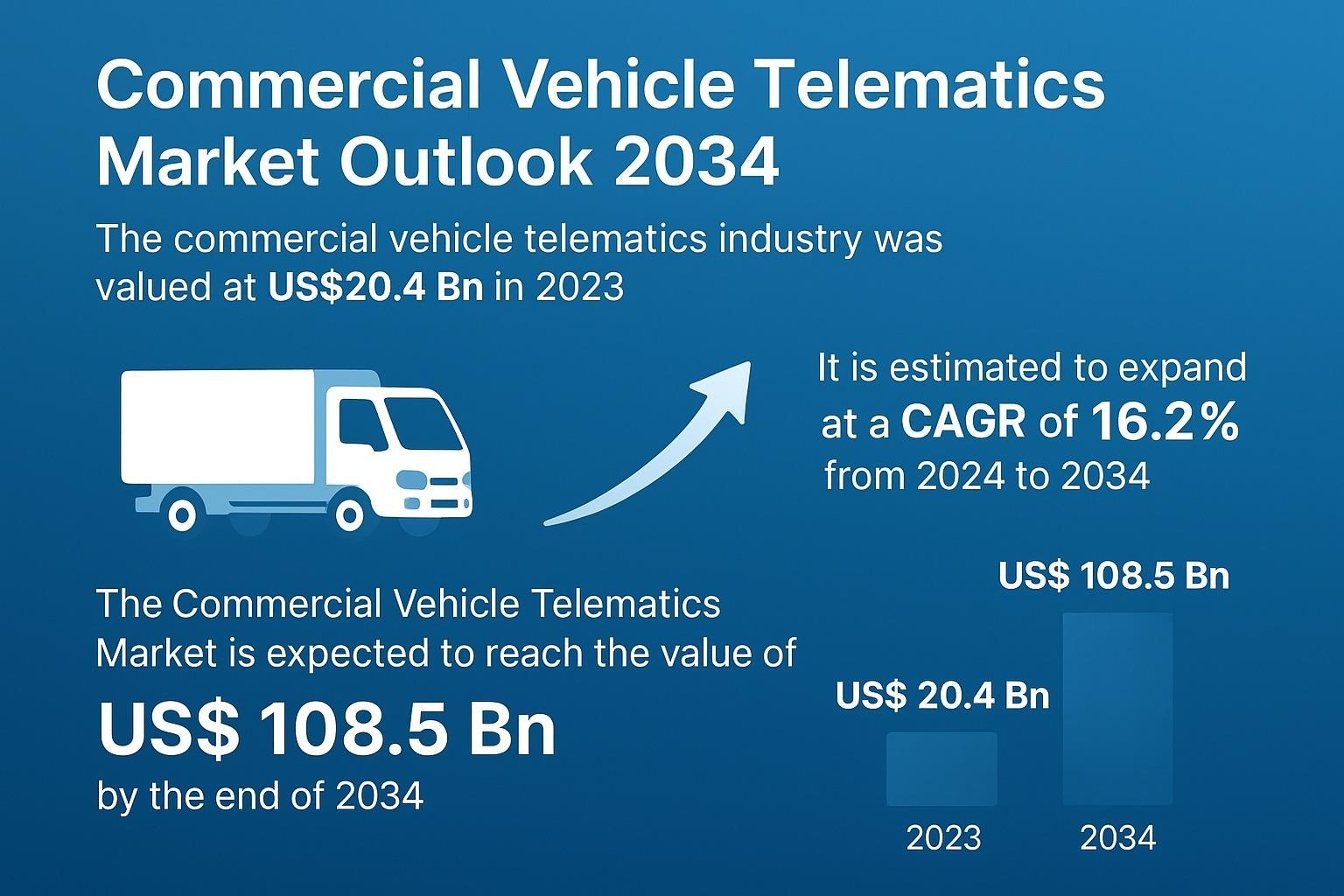 The Commercial Vehicle Telematics Market stands at the forefront of one of the most transformative shifts in the global transportation and logistics sectors. Valued at US$ 20.4 Bn in 2023, the market is expected to soar to US$ 108.5 Bn by 2034, registering an impressive CAGR of 16.2% from 2024 to 2034. This exponential growth underscores the increasing reliance on real-time data, connected vehicle technologies, and compliance-driven fleet management systems worldwide. As governments tighten safety and emissions standards, and as digital supply chains gain prominence, telematics emerges as the core intelligence layer powering fleet efficiency, predictive maintenance, and operational optimization.