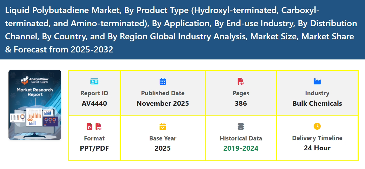 The Liquid Polybutadiene Market is experiencing steady growth driven by rising demand across adhesives, sealants, rubber compounding, coatings, and electronics manufacturing. Liquid polybutadiene (LPBD) is a low-viscosity synthetic rubber known for its excellent flexibility, strong abrasion resistance, and outstanding chemical stability. It offers superior performance in applications requiring high elasticity, low glass transition temperature, and enhanced durability. These properties make LPBD a preferred material in industries such as automotive, construction, aerospace, and polymer modification.