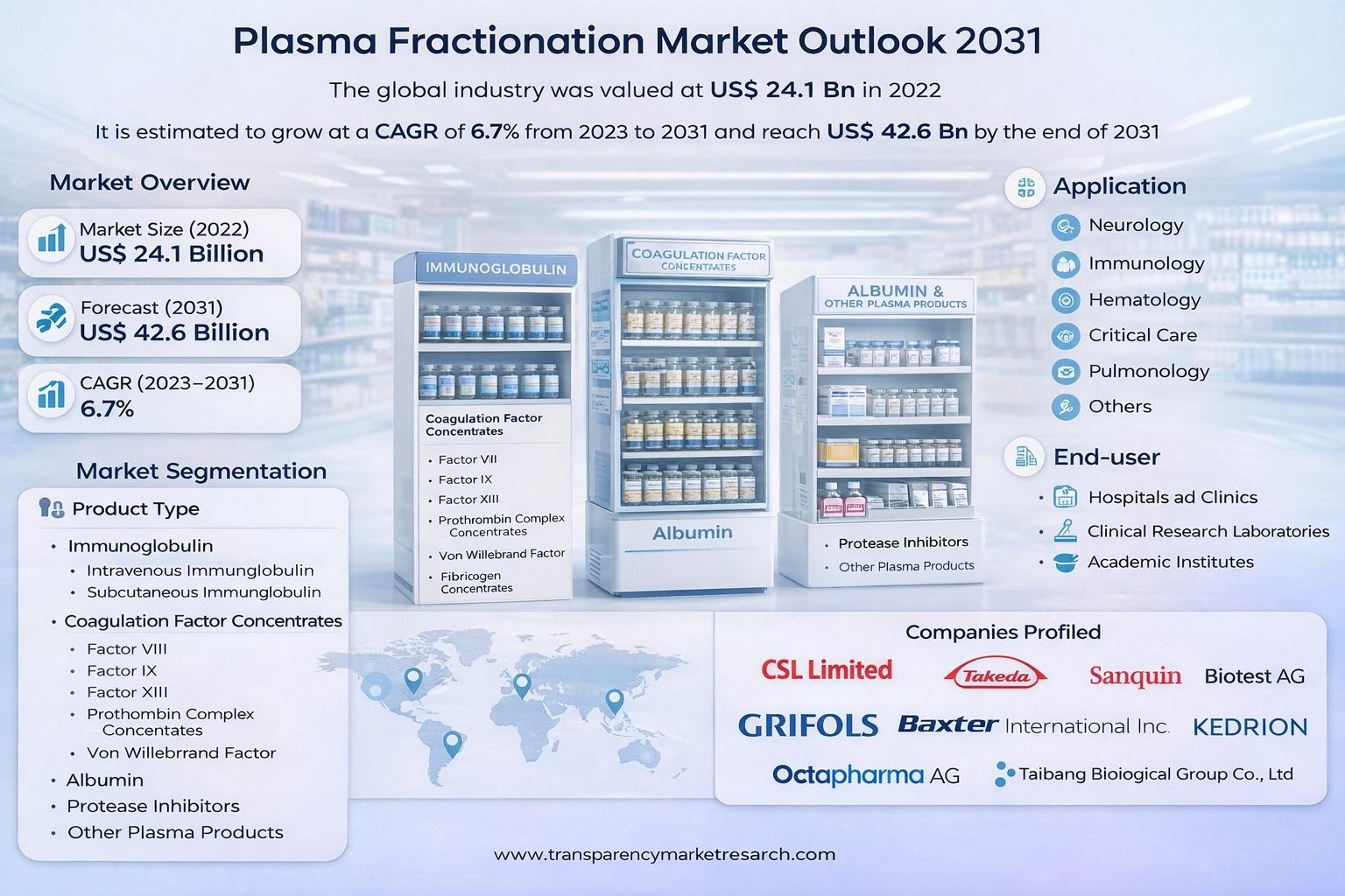 The global healthcare landscape is evolving rapidly, with rare chronic diseases and immune-related disorders emerging as critical areas of concern. At the heart of many advanced therapies addressing these conditions lies plasma fractionation a highly specialized process that transforms human blood plasma into essential, life-saving medicines. According to industry estimates, the global plasma fractionation market was valued at US$ 24.1 billion in 2022 and is projected to reach US$ 42.6 billion by 2031, expanding at a CAGR of 6.7% from 2023 to 2031. This steady growth reflects rising medical need, scientific progress, and expanding plasma collection infrastructure worldwide.